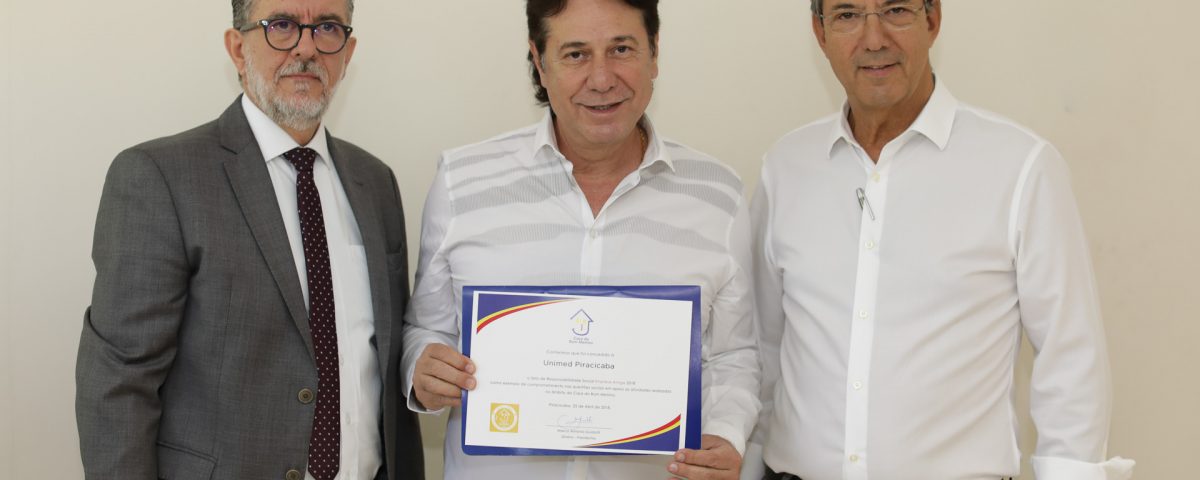 O presidente da Unimed Piracicaba, Carlos Joussef, recebeu esta semana o selo Empresa Amiga da Casa do Bom Menino pelo comprometimento nas ações sociais da instituição. A entrega da homenagem contou com a presença do presidente da entidade, Marco Antônio Guidotti, e do vice, Guilherme Mônaco de Mello, durante café da manhã organizado pelos acolhidos que participam do projeto Menino Gourmet.